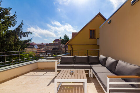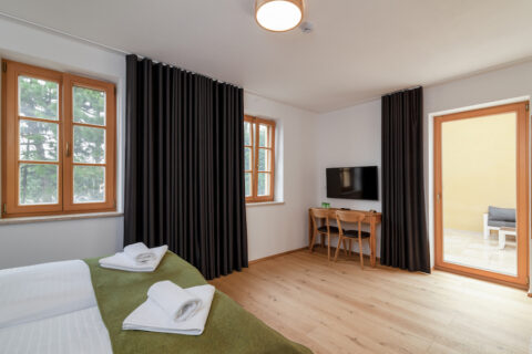 Deluxe rooms are very attractively furnished and finished to a superior standard. The equipment of Deluxe rooms includes central air conditioning, TV, coffee maker, mini fridge, wardrobe, chest of drawers, mirror, and a spacious bathroom. All Deluxe rooms are non-smoking, and some of them have access to a private terrace with outdoor seating.