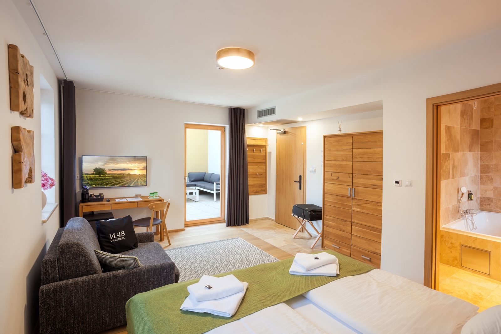 Pokoje Deluxe s terasou jsou velice atraktivně zařízené v nadstandardním provedení s velkou pohodlnou postelí. Vybavení pokojů Deluxe s terasou zahrnuje centrální klimatizaci, TV, skříň, komodu, zrcadlo a prostornou koupelnu. Všechny pokoje typu Deluxe s terasou jsou nekuřácké.